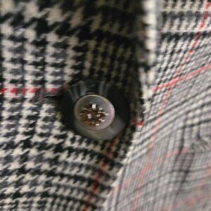 This vintage wool blend blazer features a classic plaid design with an ornate single button closure. It is fully lined and tailored for a timeless look, complete with a notched collar.