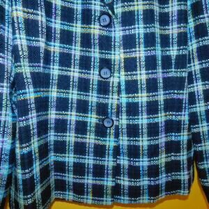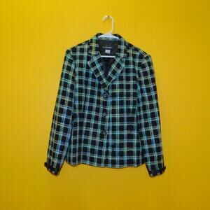 Requirements black multi color window pane plaid blazer women's. Black, yellow, lt. blue, purple & Orange colors in the beautiful fully lined blazer. Grosgrain ribbon bow details on wrist arm area. 3 button closure. Style 40211