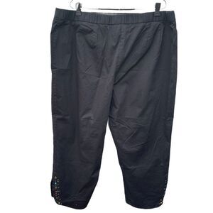 Requirements size 22 jet black cropped pants with beaded trim. Bottom sides with rounded hem slits beaded and sequined . Elastic back at waist .Top of pants side to side 21.5”, rise 13” and inseam 24”.
