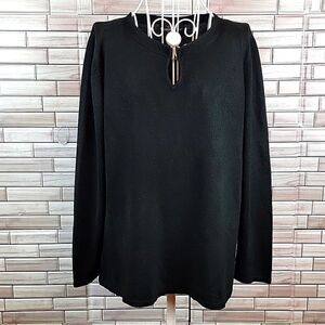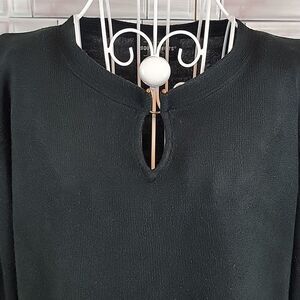 100% Acrylic super soft knit sweater with a round neckline and bronze metal detail. Simple and elegant. Good pre-owned condition. Some piling of fabric.