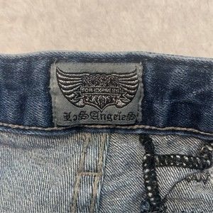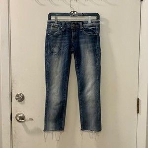 Rerock for Express Womens Blue Patched Denim Frayed Hem Skinny Capri Jeans Sz 0