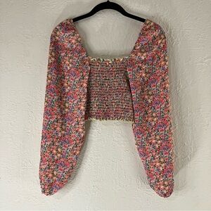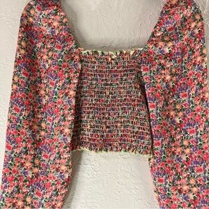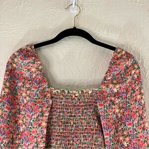 In excellent used condition no rips, tears or stains. Smocked bodice with all over ditsy floral print, long ballon sleeves, square neckline, cropped length and satin fabric.
