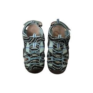 Teal blue & black braided hiking shoes with adjustable velcro back closure. Some marks from water but shoes & soles have lots of life left.