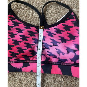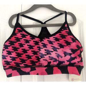 A great padded sports bra perfect for any workout. Pads are removable. Great combination of pink and black colors. Features a fun, colorful, geometric design. Has a mesh racer back design with logo print detail. Great quality.