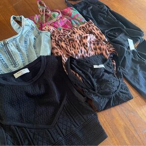Curated bundle of 7 stylish pieces perfect for resale or building an edgy-glam capsule wardrobe. Sizes range from XS–M (some flexibility depending on body shape). All in excellent condition, one is NWT. Brands + Items: • Charlie Jade snakeskin print midi dress (strappy, high-low hem, size M) • Guess vintage mini denim dress (zip front, structured, size S) • Pretty Little Thing pink leopard silky ruffle mini dress (UK 6 = US 2–4) • Zara Trafaluc black lace sleeveless bodysuit (no size tag, est. S/M) • Motel keyhole halter crop top (NWT, size S) • Babaton black textured sleeveless crop top (size XS, fits like S) • Express black mini dress with back cutouts & lace detail (size 6) All are stylish, trendy, and ready to flip or wear. Priced to move — closing my Poshmark store for personal reasons. 📦 Bundle & save more!