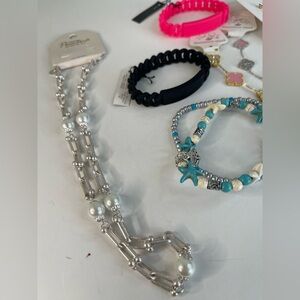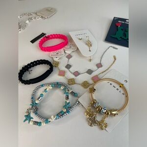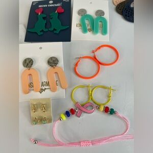 A lively assortment of earrings, bracelets, and necklaces in pink, blue, and black. Perfect for adding flair to any outfit.