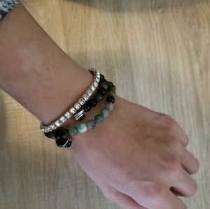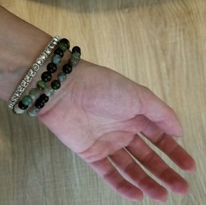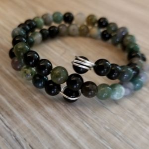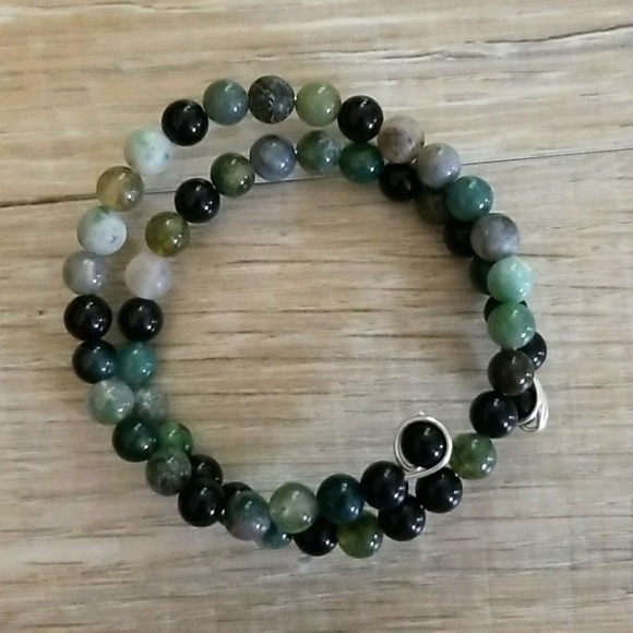 Polished obsidian and agate stone beads on a . 925 wire. Sturdy and adjustable to fit any size wrist. Dark greens, pale greens, gray, black.