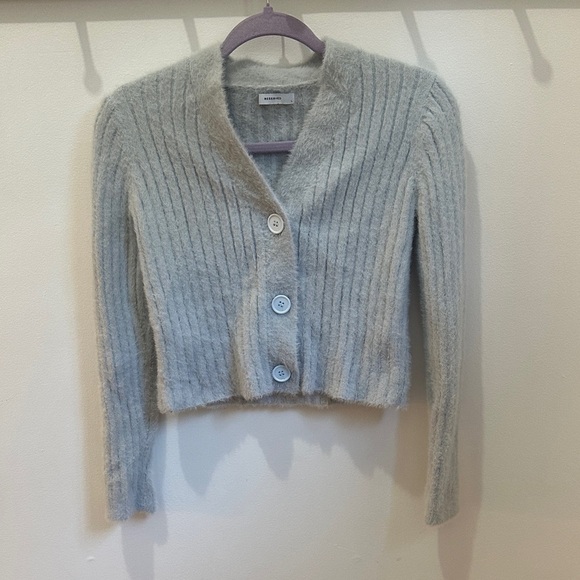 This sweater is lightly used, with minimal wear and tear, overall still in fantastic condition! This is a pale gray, super soft cardigan by the brand Reserved! It comes in a size large! It has three chunky buttons and a cropped fit. Comes from a non-smoking household.