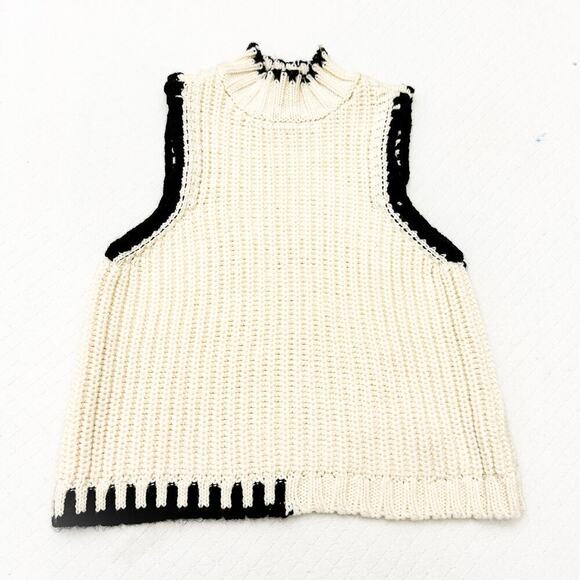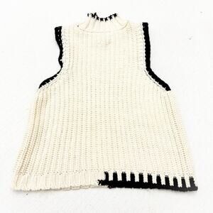 Reserved Poland Cream Sleeveless Knit Crochet Sweater Black Trim Size M