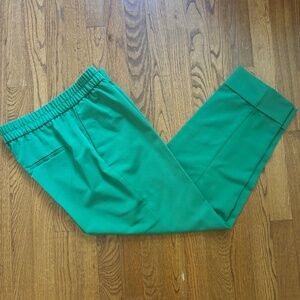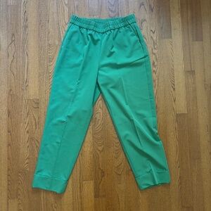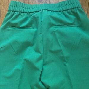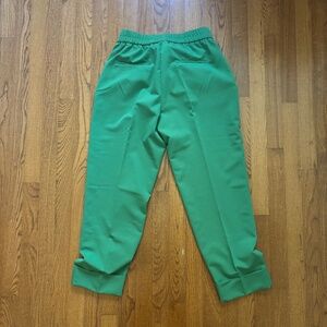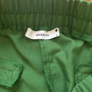 Simple design trousers made of plain fabric, elasticated waistband, two pockets, legs with pressed crease, roll-up hems.