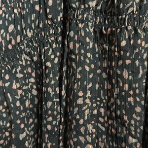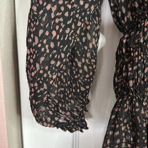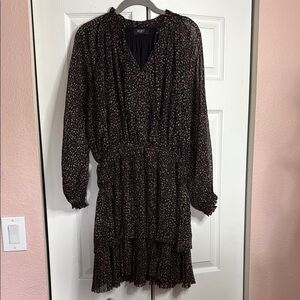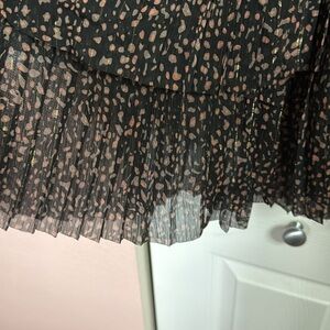 This black dress from Reset has pink and gray abstract design with gold threads. Pleated layered skirt and elastic waistband. Long sleeved with elastic cuffs and a tie at collar. Cute mini dress that could be dressy or casual.
