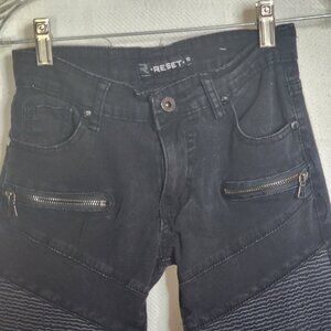 Reset Moto Black Straight Leg Zippered Pocket Detail on the Front Roughing Design Cotton Span Stretch Jeans Size 10....Cool Looking Details on these Great Stretchy Jeans that are ready for Any Day.....Like New.....