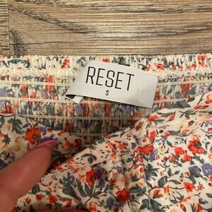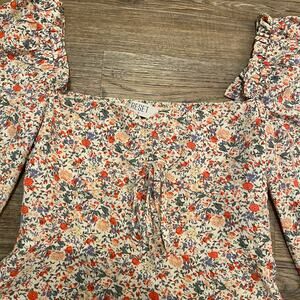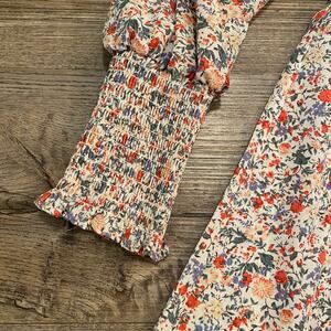 Reset Women's size Small White and Floral Sweetheart Neckline Long Sleeve Mini Dress. Women's dress in size small. White background with floral details. Ruching at wrists and back for comfort. Puffed sleeves and tie at the front. Mini dress style. Measurements as pictured. In excellent pre-owned condition, see photos for more details.