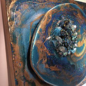 Geode shaped wood with crystals glitter and stones on top of a matching 12x12 wood panel for a 3d look. A lot of time and materials went into this piece. The place I sell my art would not allow me to display it because it is not in my usual genre. I am selling for approx. half price here and another web site. I will be adding a few more pieces.