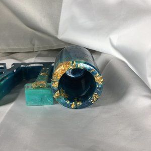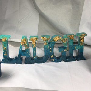 You are purchasing a Teal Blue Gold Flake Resin Laugh Sign with 2 matching Votive Candle Holders (B)