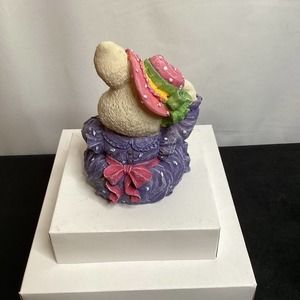 No brand sweet little rabbit wears a purple ruffled dress and a pink hat and is holding a bouquet of hot pink tulips while four little chicks sit in a basket at her feet.height 5” width 3.75” depth 3.75”. Pre owned good condition.
