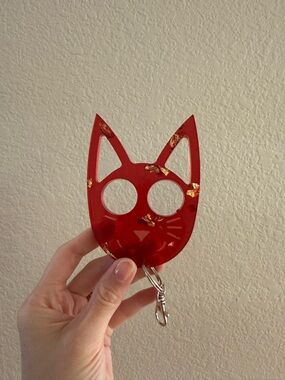 Stylish red cat-face keychain with gold fleck accents. Lightweight and durable accessory for keys or bags. Adds a playful pop of color and charm. Easy to clip on with included metal clasp.