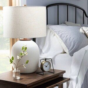 A clean and neutral lighting piece from Hearth & Hand with Magnolia, this resin table lamp features subtle texture and a classic drum shade. Its soft white finish blends effortlessly with modern farmhouse, transitional, or minimalist interiors. Condition: New in Box