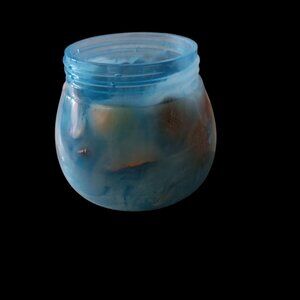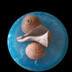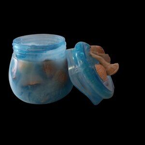 Blue and white storage container. Infused with seashells. 3" tall x 2" deep. Done in our home.