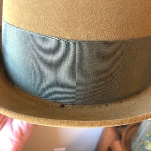 Olive green with ribbon/feather accent. A few holes (maybe from moths)