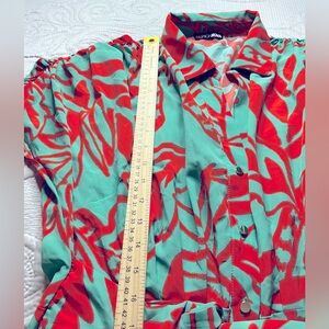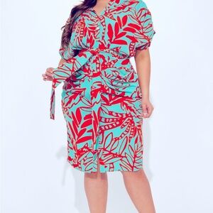 This elegant midi dress is perfect for resort wear, featuring a wrap design with a tie front for a flattering silhouette. The short dolman sleeves and notched collar add sophistication, while the vibrant red and blue colors ensure you stand out. Ideal for a chic and relaxed look.