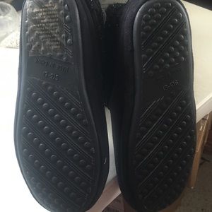 A cute house Bootie that can be worn to run quick errands, take the garbage out, walk around the house. Soft and cozy lining on the inside with black embellishments on the outside. A cute gift for someone who is hard to but for.