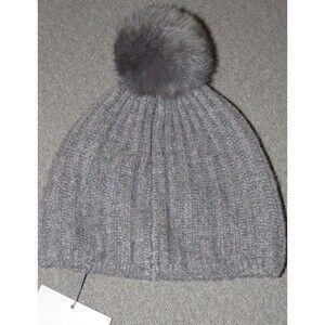 Restoration Hardware Gray Fur Trimmed Cashmere Cozy Pom Pom Beanie Hat NEW