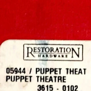 Puppets are branded by Restoration Hardware. Absolutely a wonderful play set with hours of fun in store for the next owner. Comes from a pet free and smoke free environment. In Excellent Condition!