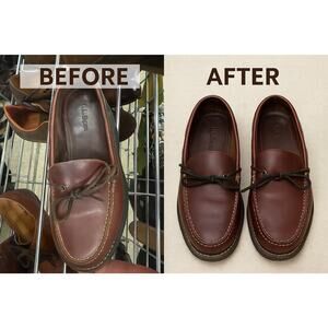 Step into timeless craftsmanship with these restored L.L. Bean moccasins. Featuring handsewn oxblood leather uppers and durable lug soles, these classic shoes have been thoroughly cleaned, leather-conditioned, and are ready to wear. See before-and-after photo for full restoration.
