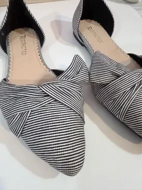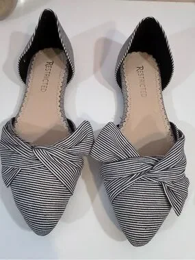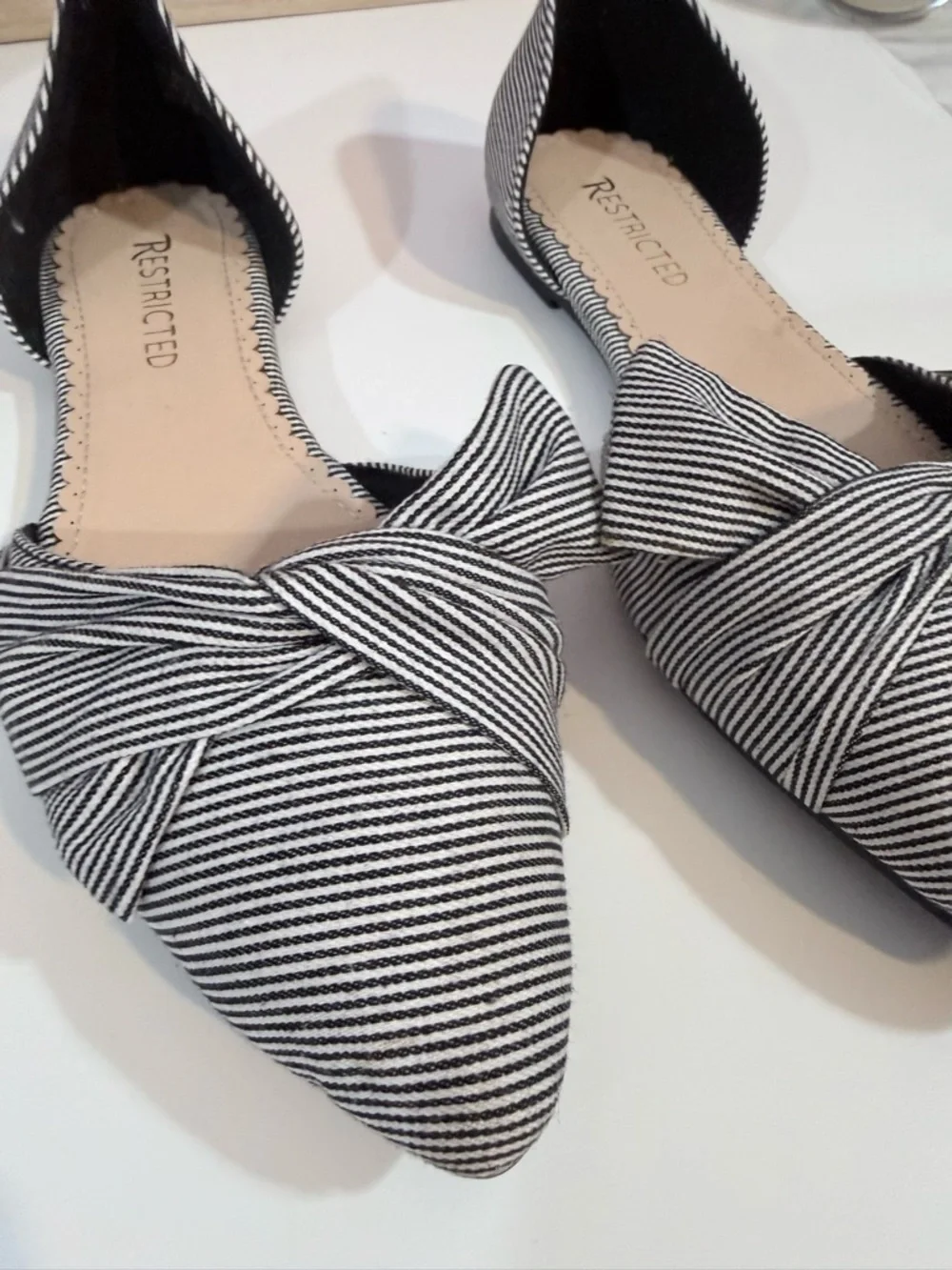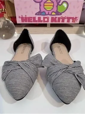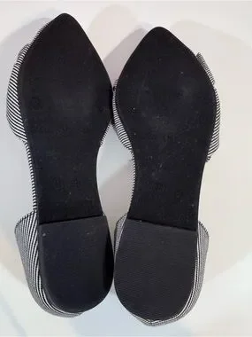 Cute flats with a posh bow detail on front of shoe. Striped black and white preppy design. Size: 8 1/2 New no tag no box.