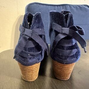 Elegant velvet ankle boots with a deep blue hue. Features a stylish side zipper and bow detail. Perfect for versatile wear.