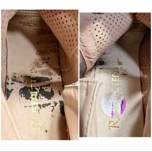 Insole footbed lining has markings from where wearer removed an added orthopedic pad (original lining and insole still intact--cosmetic only and not seen from outside), tiny scratch and mark at back heel, as shown, otherwise, excellent condition. Lovely!