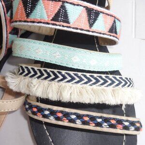 Restricted women's sandals size 8, aqua, coral ,cream yarn trim, adjustable heel straps, rubber bottoms,