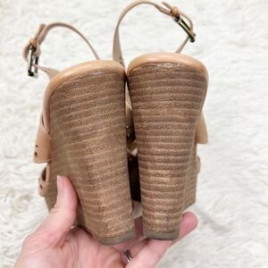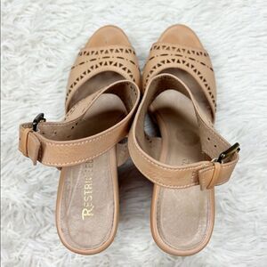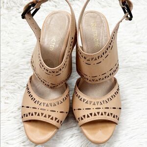Super cute pre-owned Restricted Tan Leather Laser Cut Wedge Heels Size 7.5. Buckles on the sides. 4” heel height. Normal amount of wear. Please ask all questions before purchasing.