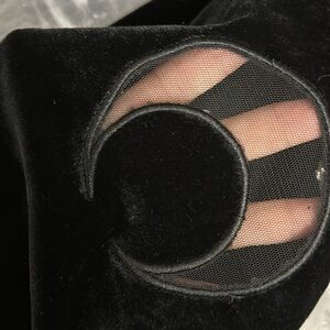 Made of a super soft velvet, these high-waisted leggings are very comfortable and will fit you perfectly. You will look gorgeous in these black gothic leggings with two crescent moons. The moons aren't simply printed; they are sewn with transparent mesh. On the front there is a silver metal zip fastener with a crescent moon zipper pull. There is elastic in the waist to make them an even more comfortable fit.