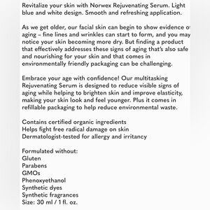 Revitalize your skin with Norwex Rejuvenating Serum. Light blue and white design. Smooth and refreshing application.