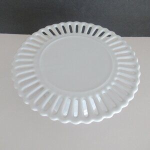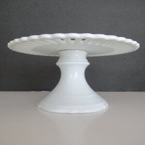 7.5" Diameter Reticulated Pedestal Cake Stand with scalloped rim and solid center in the center. All White porcelain.
