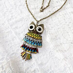 Cute reticulated owl pendant necklace on a long gold-tone chain. The owl is metal with enamel paint and is in 5 reticulated pieces. The owl is 3 1/2" by 1 1/2". and the chain is 31" from end to end. It is in excellent condition.