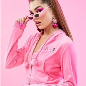 lead the way! This soft velour jacket has a drawstring hood with pompom ties, embroidered patches on the chest, back, and sleeve, two front pockets, and a front zip up closure.