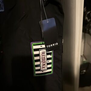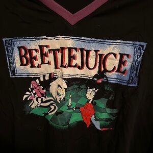 Black tee with Beetlejuice graphic. Features purple trim. Fun and stylish.