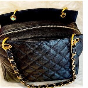 Caviar Tote Bag. BEAUTIFUL condition. No marks. No rips. No tears. No stains. Gorgeous quilted CHANEL. Very hard to find size. The Chanel Petit Timeless Tote was discontinued in 2012. This bag is crafted from black caviar leather to ensure this bag holds its structured shape and has been decorated with the quilted diamond pattern and CC logo. The gold hardware of the chunky chain strap and protective feet really sparkle against the black leather to great a glamorous handbag.