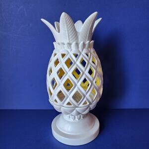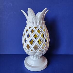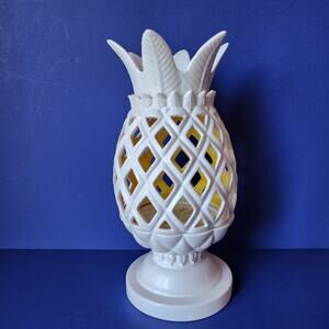 Retired Harry Slatkin 2010 Large Pineapple 3 Wick Candle Holder Yellow Inside. Pre-owned. Does have 1 small chip on one of the pineapple fronds, as pictured. Otherwise in excellent condition. Holds a 3 wick jar candle. Measures approximately 11.5" high by 6" in diameter. Please see pictures and contact me with questions.