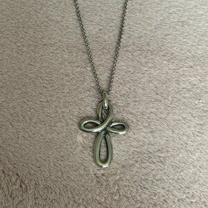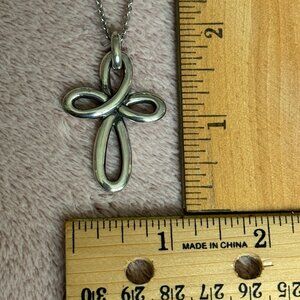 Retired and timeless! This James Avery sterling silver Eternal Ribbon Cross pendant comes with a matching necklace, making it a meaningful piece to express faith, hope, or devotion.