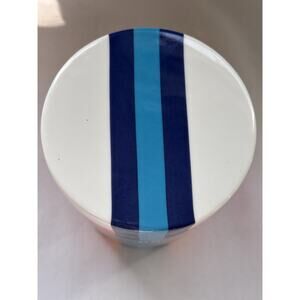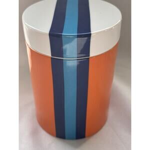 The retired Jonathan Adler Carnaby Calories Canister is a medium-sized round ceramic storage container featuring a striped pattern in multicolor. With a modern style and food/kitchen theme, this original canister is a collectible piece from the renowned Jonathan Adler brand. The canister stands at 6 inches tall and has a diameter of 4.25 inches, making it a stylish and functional addition to any kitchen storage and organization setup.