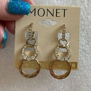 For Sale is a Pair of Monet Gold-Tone Dangle Earrings with 14K Gold Posts. They measure about 2 7/8” L x 6/8” at the widest part at the bottom. These have crystals on the top circle and middle circle and the bottom circle has texture. These are stunning in person, sparkling from all angles, and will look great with your outfits.