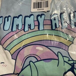 Sometimes food is worth the tummy ache! If you've ever eaten something despite knowing what it'll do to your tummy, this tee is for you! It features a pastel creature sipping on strawberry milk, with a rainbow with frowning clouds behind, plus "Tummy ache survivor" in bubble lettering.