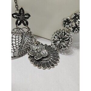This stunning statement necklace from Premier Designs features a chunky art deco floral medallion design that is sure to turn heads. The necklace is made of silver tone metal in a round link chain type with an adjustable lobster closure. It is 19 inches in length and signed by the designer, making it a unique and original piece of jewelry.