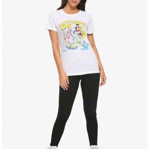 This white tee from Sailor Moon features your favorite Inner Guardians with Sailor Moon and Sailor Chibi Moon, with the skyline and a rainbow behind.