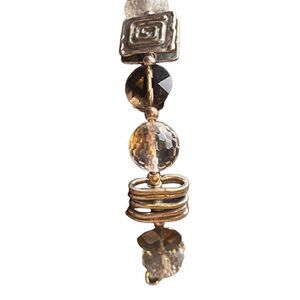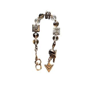 Artistic retired Silpada bracelet crafted in fine sterling silver featuring four unique creative links alternating with faceted clear crystal and smoky Quartz beads. It has a toggle clasp, adjustable length and logo charm.
