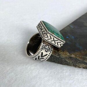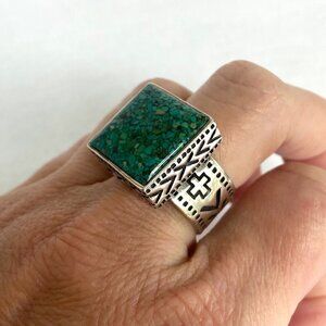 Signed Retired Silpada Sterling Silver 925 Southwest Style Heavy Square Crushed Turquoise Chunky Stamped Ring Featuring V ≫ Stamped Pattern Band With Equal Arms Cross